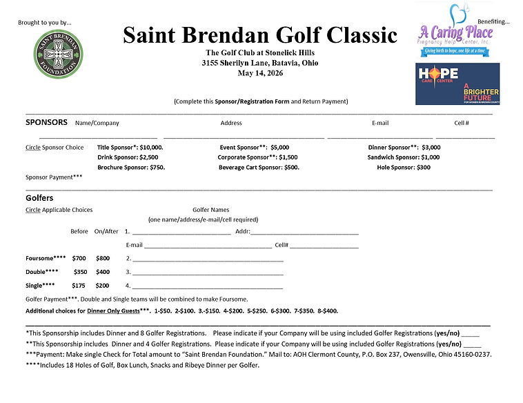 2/1/2026: Since the institution of this website in late January of this year, AOH members have been hard at work preparing for this years Saint Brendan Golf Classic. The outing will take place on Thursday, May 14, 2026. Once again the Golf Classic will be at the Golf Club At Stonelick Hills, 3155 Sherilyn Lane, Batavia, Ohio 45103.